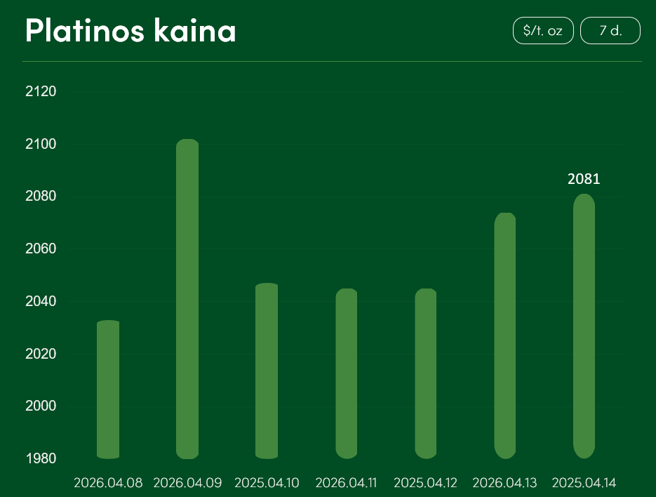 Pasaulinė platinos kaina nuo balandžio 8 iki balandžio 14 dienos patyrė daugiau, nei 2,3 proc. augimą ir pasiekė 2081 USD už Trojos unciją. Vidutinė platinos kaina balandžio mėnesį siekia 1999 USD už Trojos unciją.