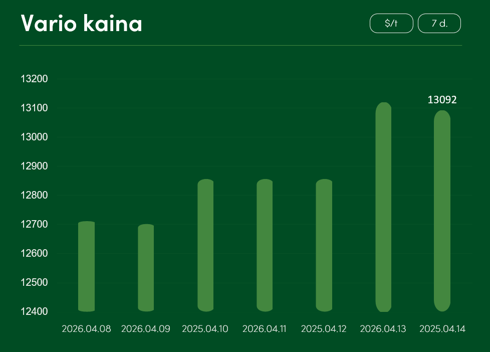 Nuo balandžio 8 iki balandžio 14 dienos pasaulinė vario kaina augo beveik 3 proc. ir pasiekė 13092 USD už toną.