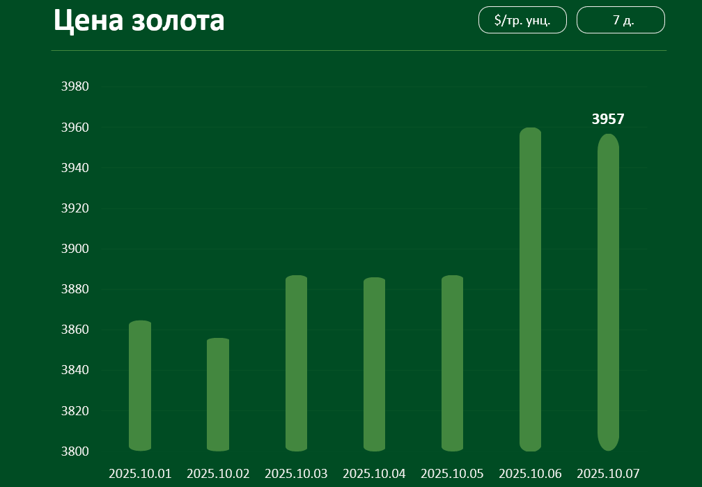 С 1 по 7 октября мировая цена на золото выросла более чем на 2,2%, достигнув 3957 $/тр. унц.