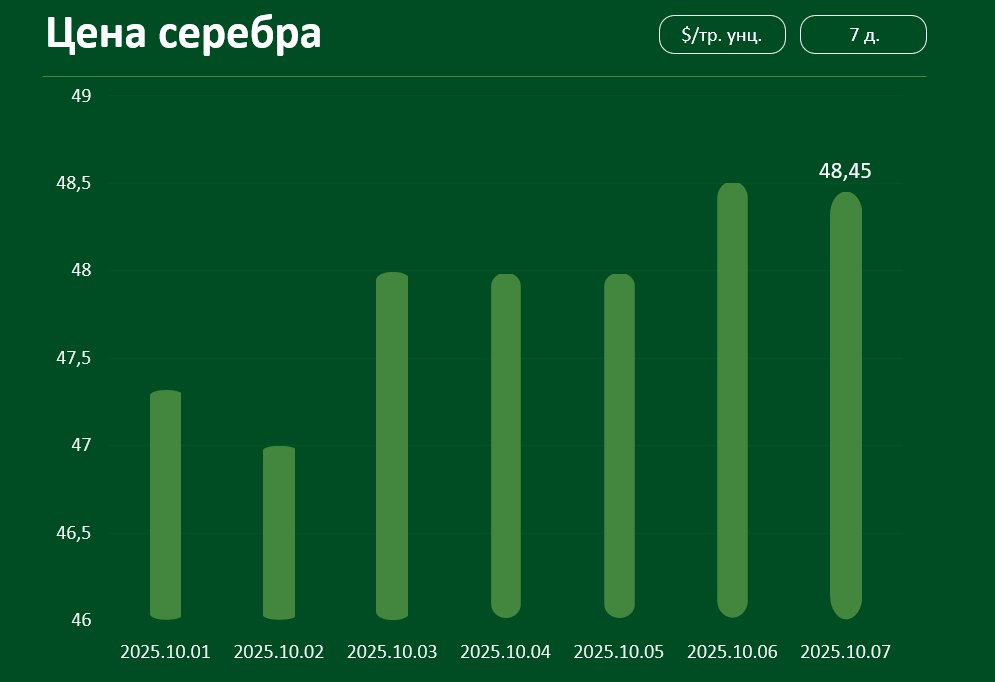С 1 по 7 октября мировая цена на серебро выросла более чем на 2,3%, достигнув 48,45 $/тр. унц.