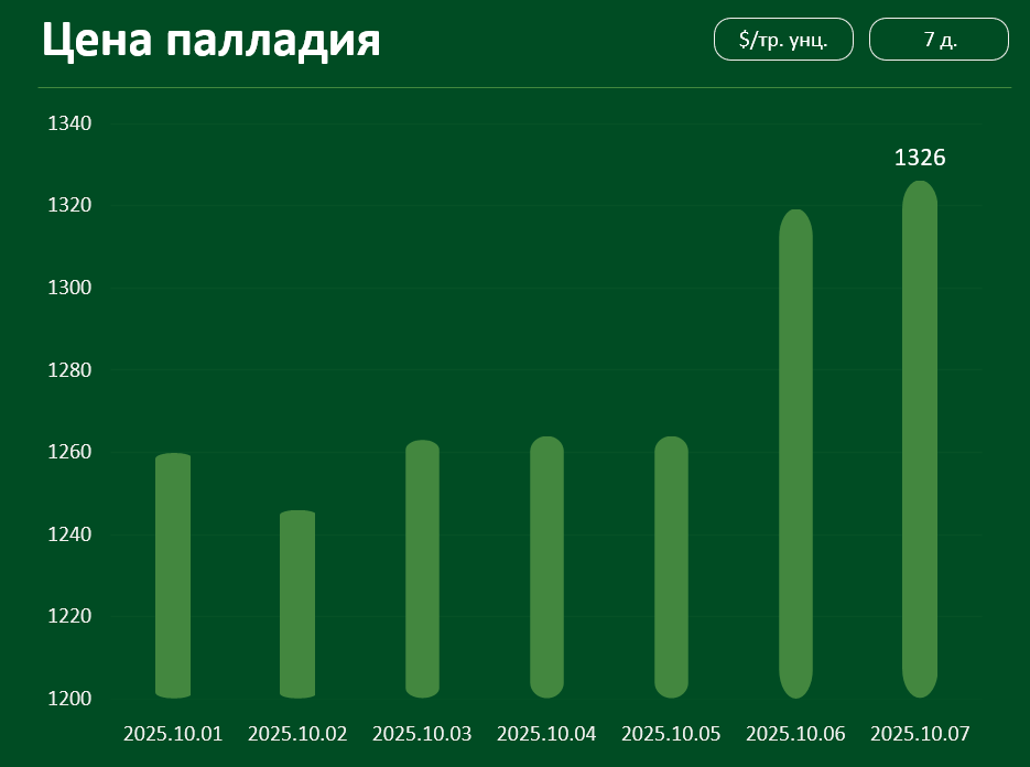 С 1 по 7 октября мировая цена на палладий выросла более чем на 5%, достигнув 1326 $/тр. унц.
