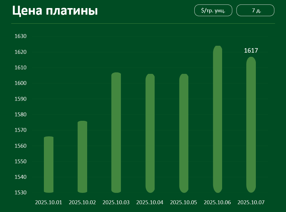 С 1 по 7 октября мировая цена на платину выросла более чем на 3,2%, достигнув 1617 $/тр. унц.