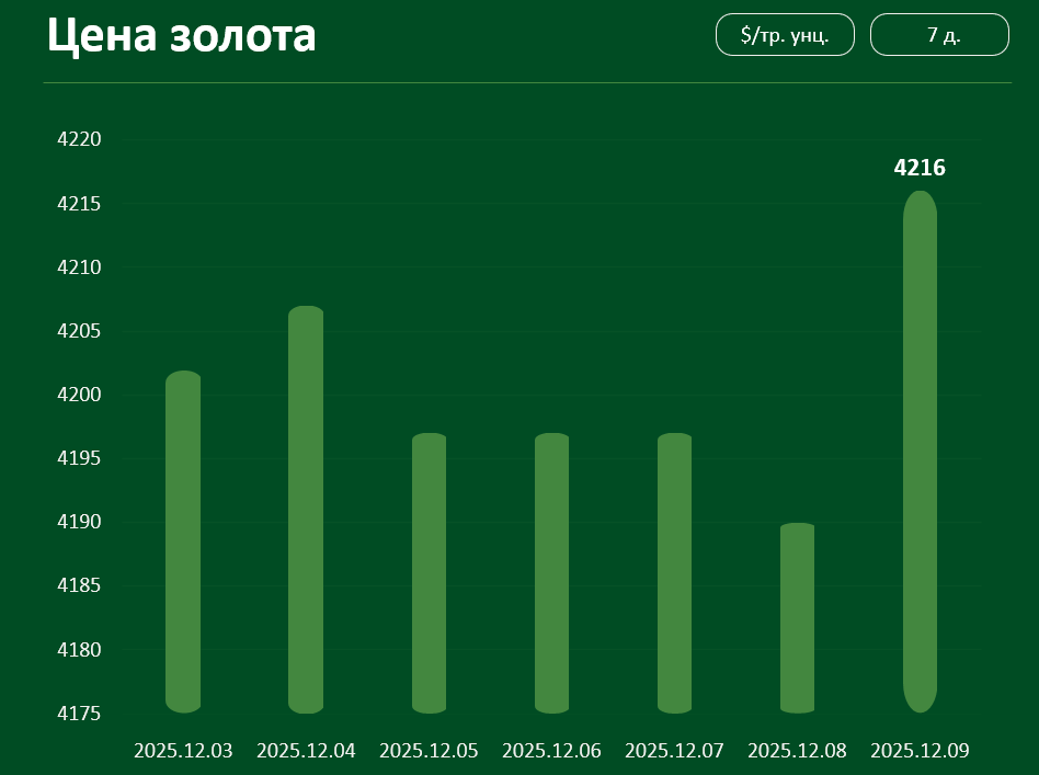 С 3 по 9 декабря мировая цена на золото претерпела лишь незначительные изменения. 9 декабря котировки достигли 4216 долларов за тройскую унцию.