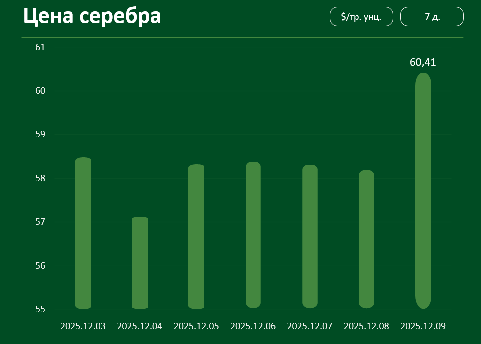 Мировая цена на серебро в течение прошедшей недели неоднократно обновляла исторические максимумы. 9 декабря котировки серебра достигли 60,41 доллара за тройскую унцию.