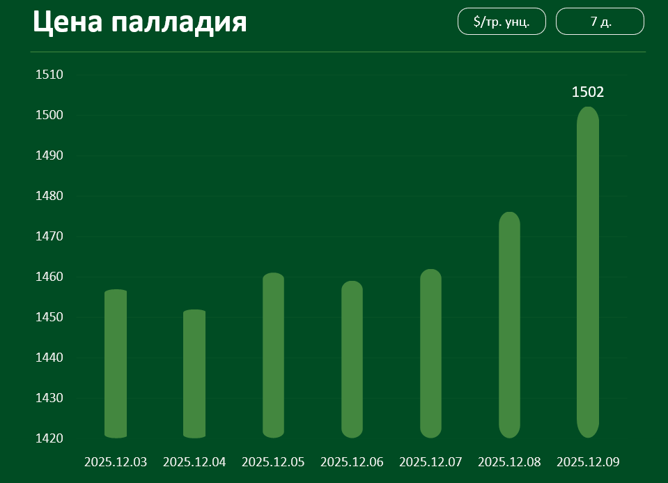 Мировая цена на палладий с 3 по 9 декабря выросла примерно на 3,1%, достигнув 1502 долларов за тройскую унцию.
