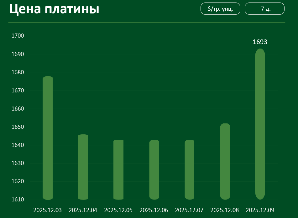 За тот же период мировая цена на платину практически не изменилась и 9 декабря составила 1693 доллара за тройскую унцию.