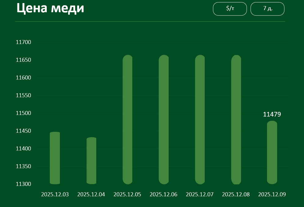 Мировая цена на медь также не показала значимых колебаний с 3 по 9 декабря. 9 декабря котировки достигли 11 479 долларов за тонну.