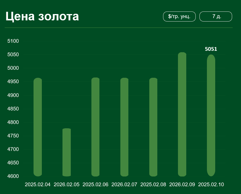 Мировая цена золота в период с 4 по 10 февраля выросла более чем на 1,7% и достигла 5 051 доллара США за тройскую унцию. Средняя цена золота в феврале составляет 4 909 долларов США за тройскую унцию.
