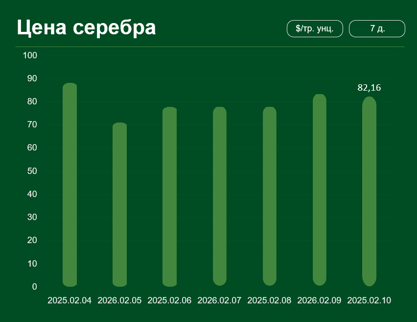 Мировая цена серебра в период с 4 по 10 февраля снизилась более чем на 6,8% и достигла 82,16 доллара США за тройскую унцию. Средняя цена серебра в феврале составляет 82,34 доллара США за тройскую унцию.