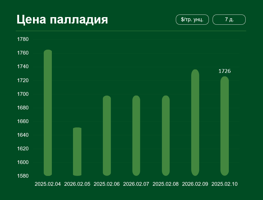 Мировая цена на палладий за последнюю неделю продемонстрировала лишь незначительные колебания. По состоянию на 10 февраля цена палладия составила 1 726 долларов США за тройскую унцию, а среднее значение за февраль — 1 746 долларов США за тройскую унцию.