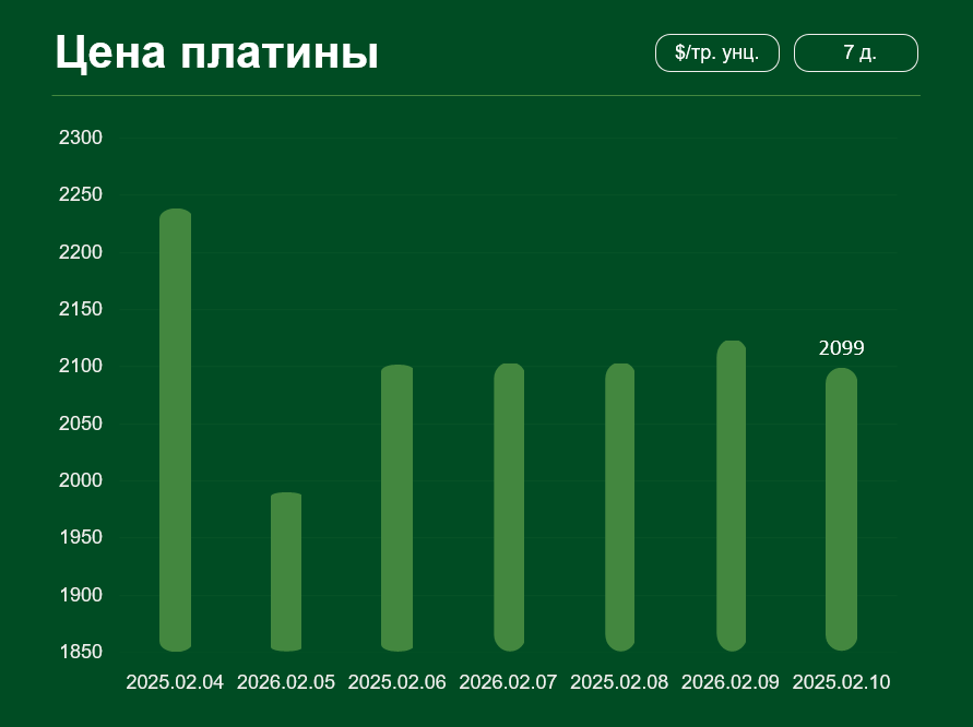 Мировая цена на платину в период с 4 по 10 февраля снизилась более чем на 6% и 10 февраля достигла уровня 2 099 долларов США за тройскую унцию. Средняя цена платины в феврале составляет 2 144 доллара США за тройскую унцию.