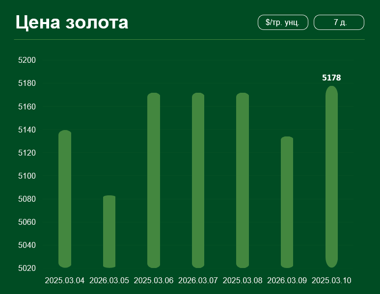 Мировая цена золота с 4 по 10 марта выросла лишь незначительно. 10 марта цена золота достигла 5178 долларов США за тройскую унцию. Средняя цена золота в марте составляет 5145 долларов США за тройскую унцию.