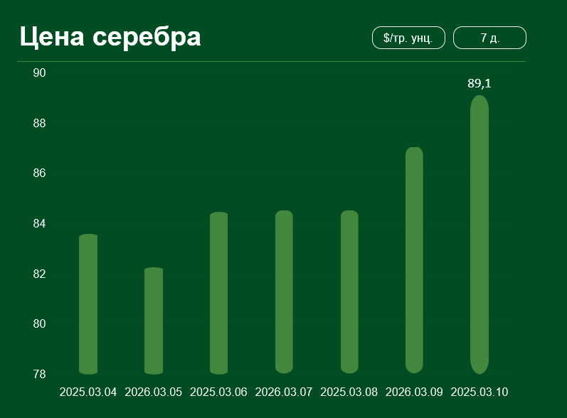 Мировая цена серебра с 4 по 10 марта выросла более чем на 6,6% и достигла 89,1 доллара США за тройскую унцию. Средняя цена серебра в марте составляет 85,85 доллара США за тройскую унцию.