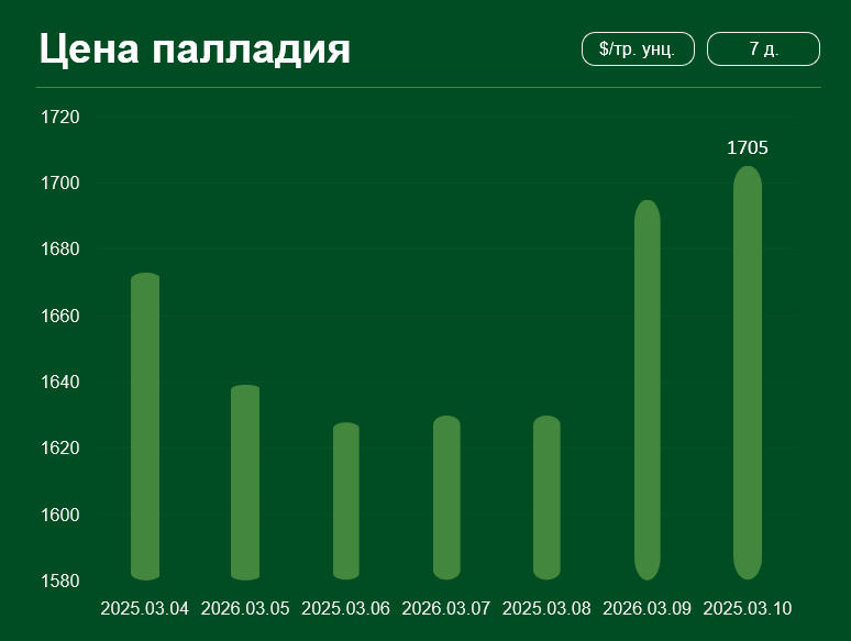Мировая цена на палладий с 4 по 10 марта выросла более чем на 1,9% и достигла 1705 долларов США за тройскую унцию. Средняя цена палладия в марте составляет 1686 долларов США за тройскую унцию.