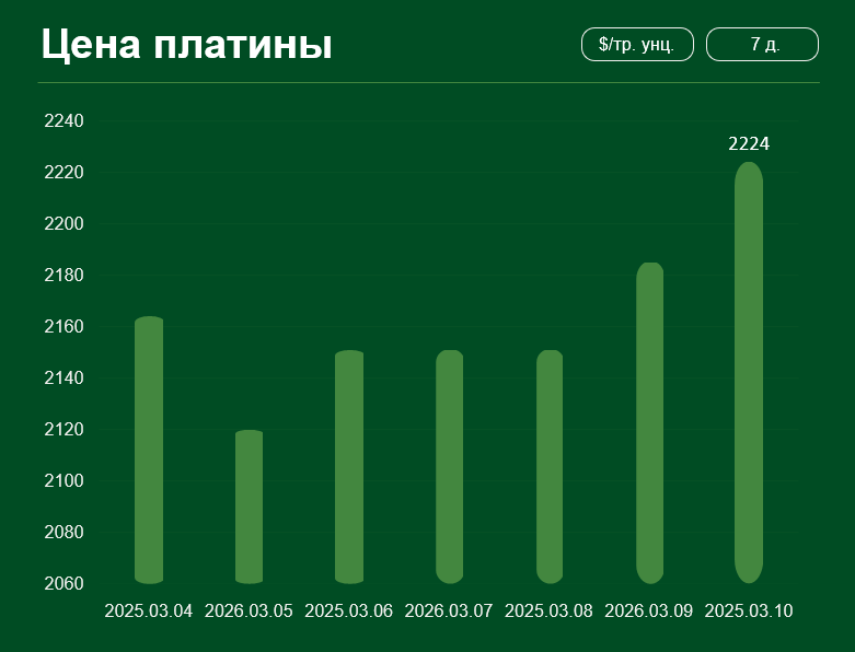 Мировая цена на платину с 4 по 10 марта выросла более чем на 2,7% и достигла 2224 долларов США за тройскую унцию. Средняя цена платины в марте составляет 2173 долларов США за тройскую унцию.
