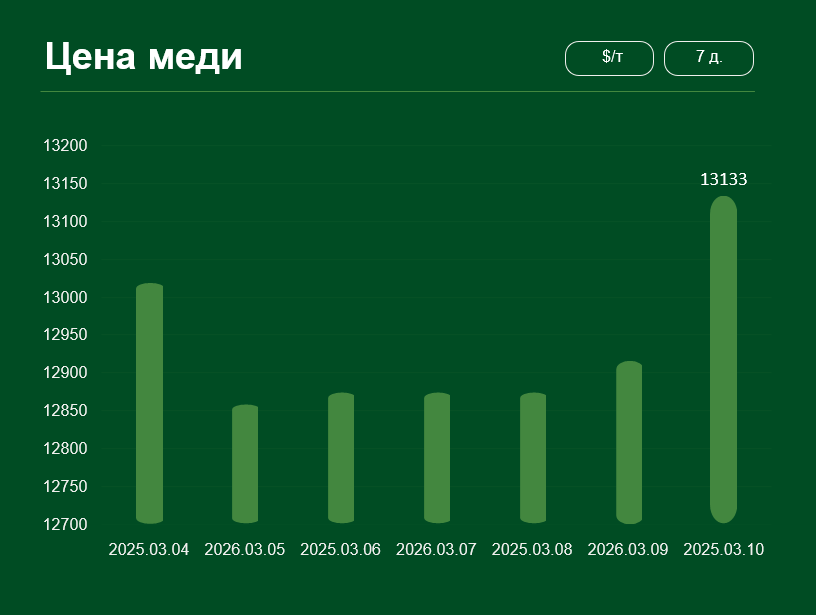 Мировая цена на медь с 4 по 10 марта зафиксировала минимальные изменения; 10 марта цена меди достигла 13 133 долларов США за тонну.