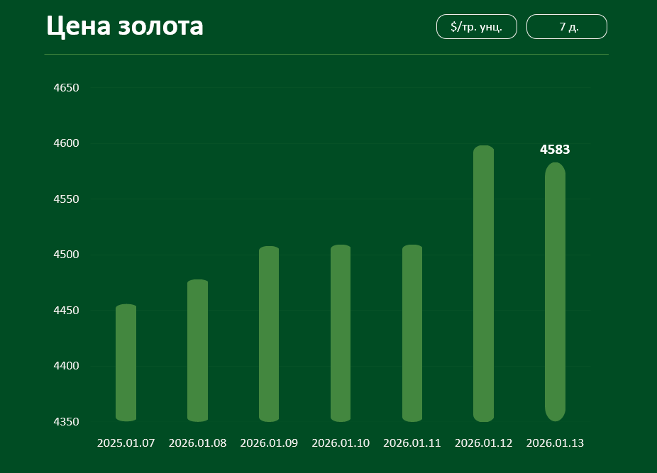 Мировая цена золота за прошлую неделю выросла более чем на 2,8%, установив новые исторические максимумы, и 13 января достигла уровня 4 583 доллара США за тройскую унцию.