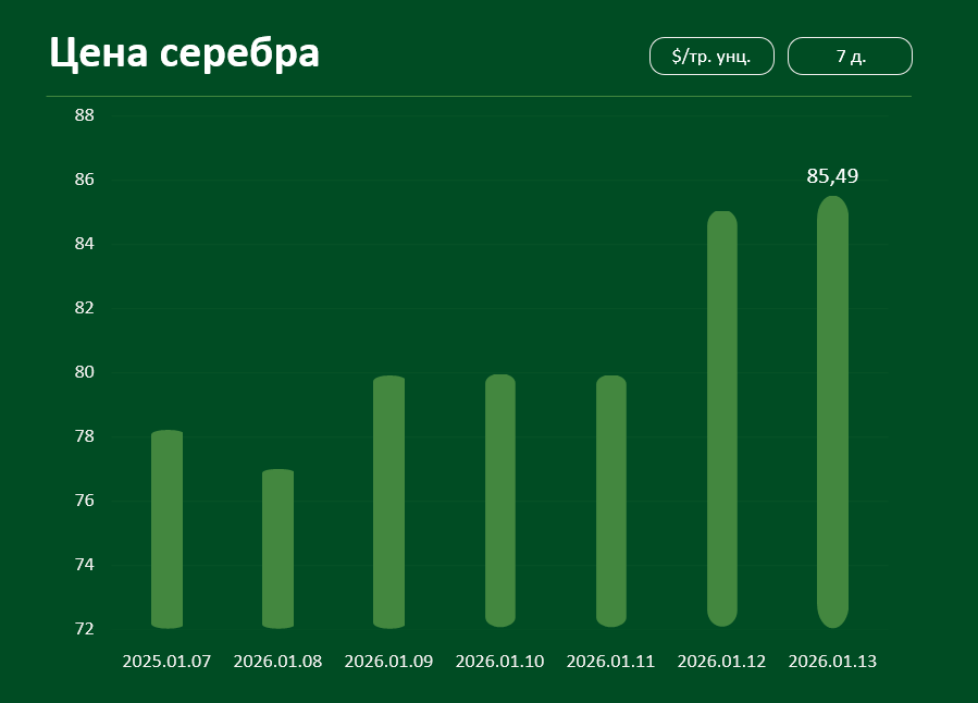 Мировая цена серебра также установила новый исторический максимум, увеличившись более чем на 9,3% в период с 7 по 13 января и достигнув 85,49 доллара США за тройскую унцию.