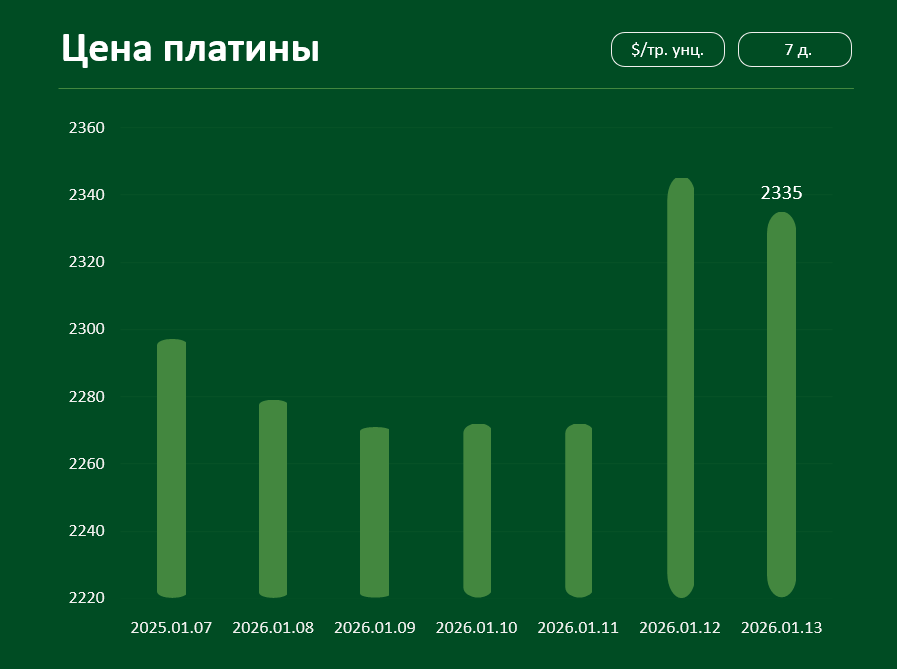 Цена на платину за тот же период увеличилась более чем на 1,5% и 13 января достигла 2 335 долларов США за тройскую унцию.