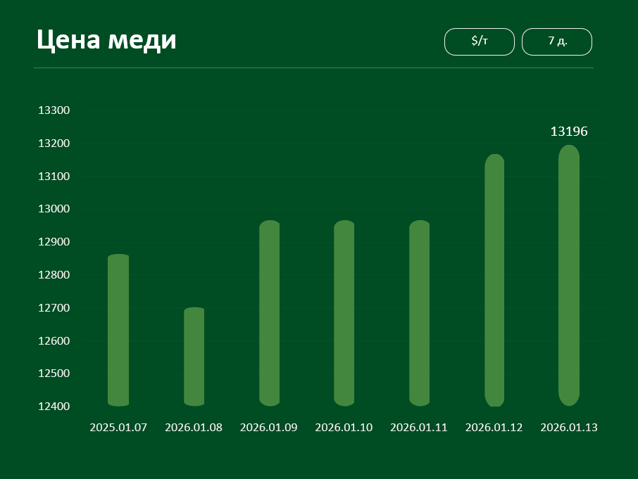 Мировая цена меди с 7 по 13 января выросла более чем на 2,5% и достигла 13 196 долларов США за тонну.
