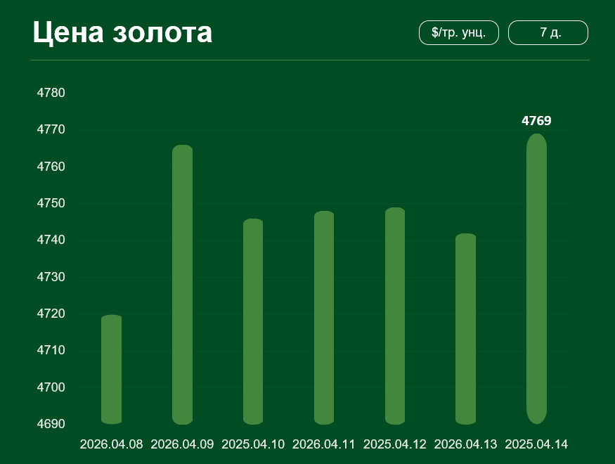 На прошлой неделе основные рынки драгоценных металлов столкнулись с периодом стабилизации цен. Это в первую очередь связано с оптимистичными геополитическими новостями, изменениями в секторе цен на нефть и противоречивыми сигналами денежно-кредитной политики центральных банков. Мировая цена золота с 8 по 14 апреля выросла более чем на 1% и достигла 4769 долларов США за тройскую унцию. Средняя цена золота в апреле составляет 4719 долларов США за тройскую унцию