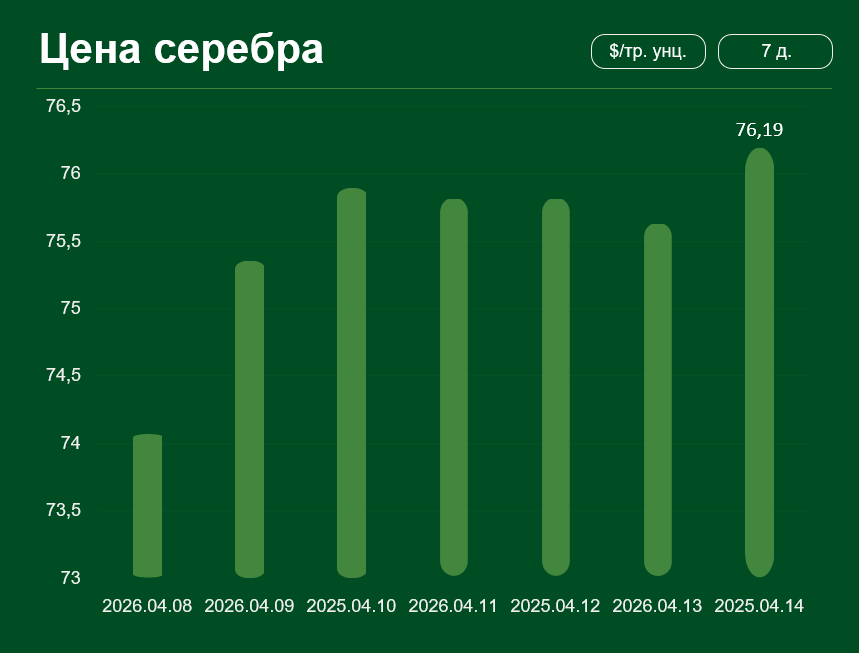 Мировая цена серебра с 8 по 14 апреля выросла более чем на 2,8% и достигла 76,19 долларов США за тройскую унцию. Средняя цена серебра в апреле составляет 74,06 долларов США за тройскую унцию.