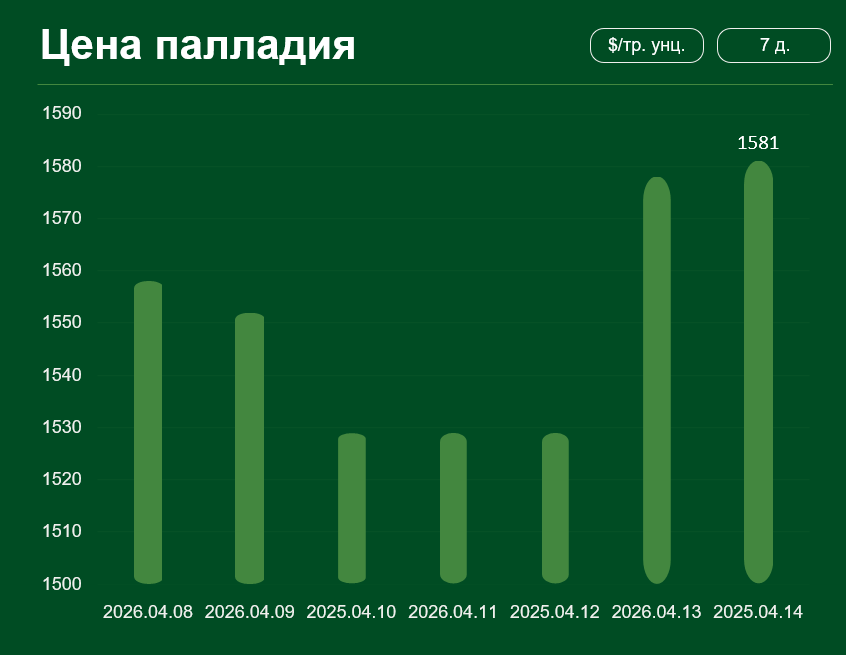 Мировая цена на палладий с 8 по 14 апреля выросла более чем на 1,4% и достигла 1581 доллара США за тройскую унцию. Средняя цена палладия в апреле составляет 1511 долларов США за тройскую унцию.
