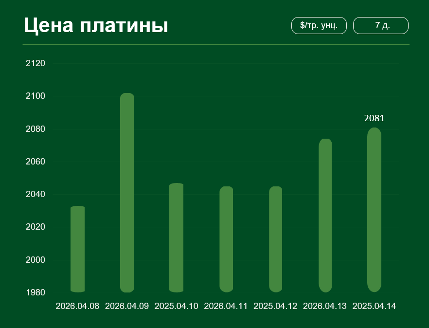 Мировая цена на платину с 8 по 14 апреля выросла более чем на 2,3% и достигла 2081 доллара США за тройскую унцию. Средняя цена платины в апреле составляет 1999 долларов США за тройскую унцию.