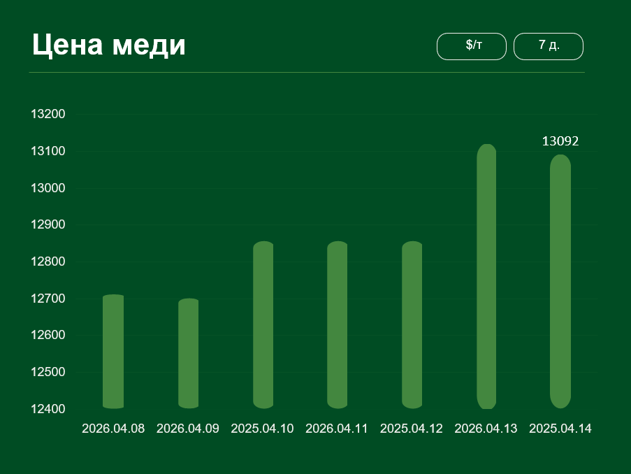 С 8 по 14 апреля мировая цена на медь выросла почти на 3% и достигла 13 092 долларов США за тонну.