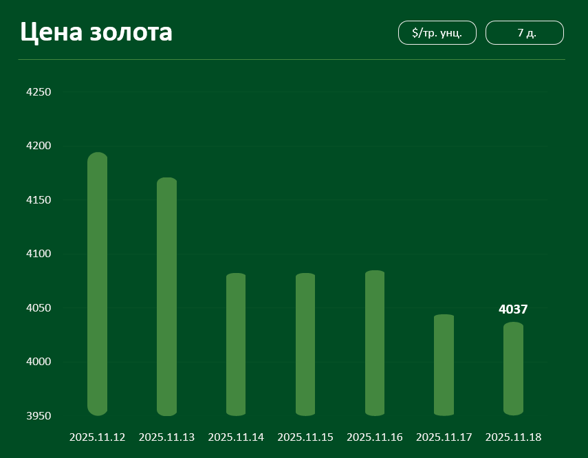 Мировая цена на золото с 12 по 18 ноября снизилась более чем на 3,7% и достигла 4017 $ за тройскую унцию.