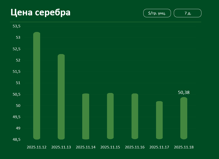 Мировая цена на серебро с 12 по 18 ноября снизилась более чем на 5,3% и достигла 50,38 $ за тройскую унцию.