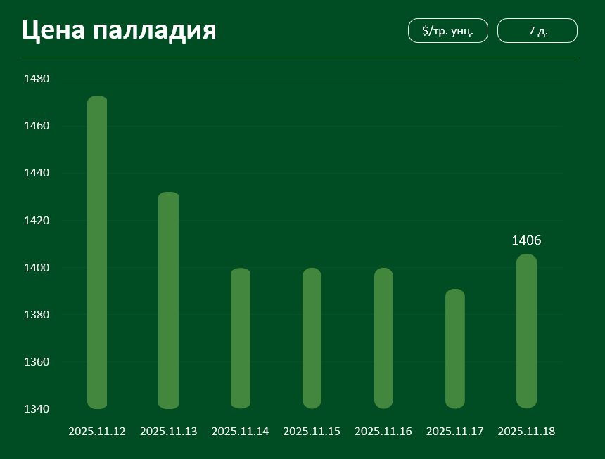 Мировая цена на палладий за указанный период снизилась примерно на 4,5% и достигла 1406 $ за тройскую унцию.