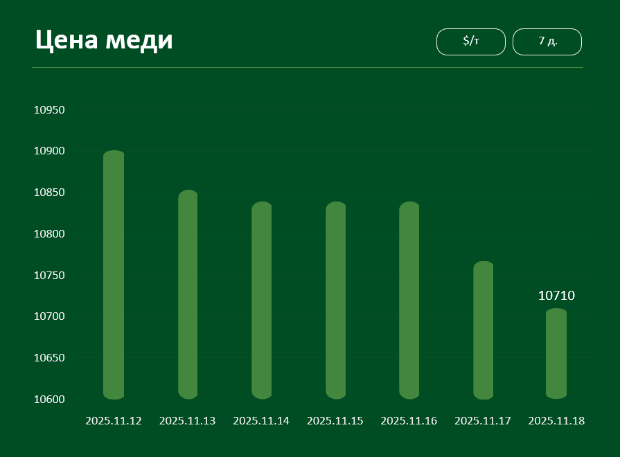 Цена на полудрагоценный металл медь за указанный период столкнулась с минимальными изменениями. 18 ноября мировая цена на медь достигла 10710 $ за тонну.