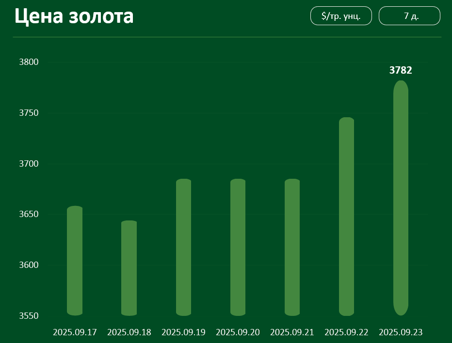 Мировая цена на золото с 17 по 23 сентября выросла более чем на 3% и достигла 3782 долл. за тройскую унцию.