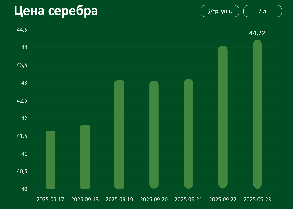 Мировая цена на серебро с 17 по 23 сентября выросла более чем на 6% и достигла 44,22 долл. за тройскую унцию.