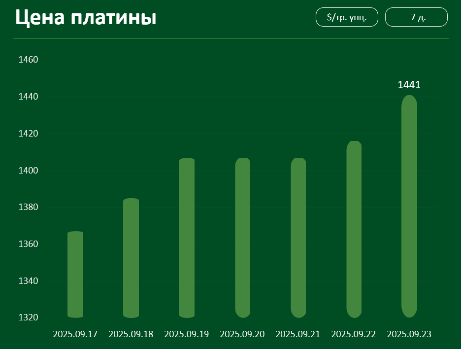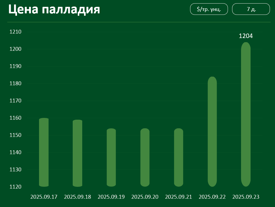 С 17 по 23 сентября цена палладия выросла примерно на 3,8% и достигла 1204 долл. за тройскую унцию.