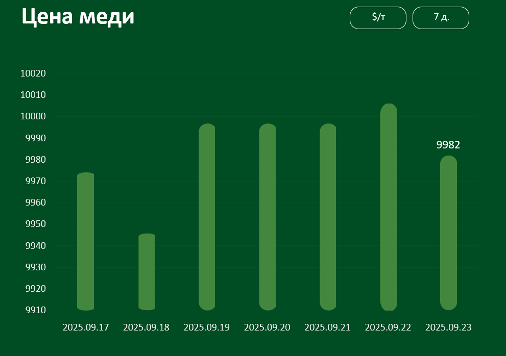 Мировая цена на медь с 17 по 23 сентября претерпела минимальные изменения; 23 сентября она составила 9982 долл. за тонну.