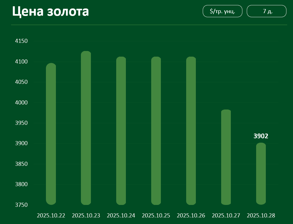 Мировая цена золота с 22 по 28 октября снизилась примерно на 4,7%, достигнув 3902 $ за тройскую унцию.