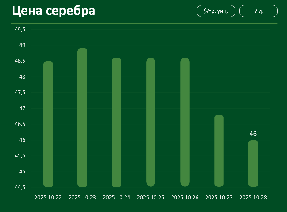 Мировая цена серебра с 22 по 28 октября снизилась более чем на 5%, достигнув 46 $ за тройскую унцию.