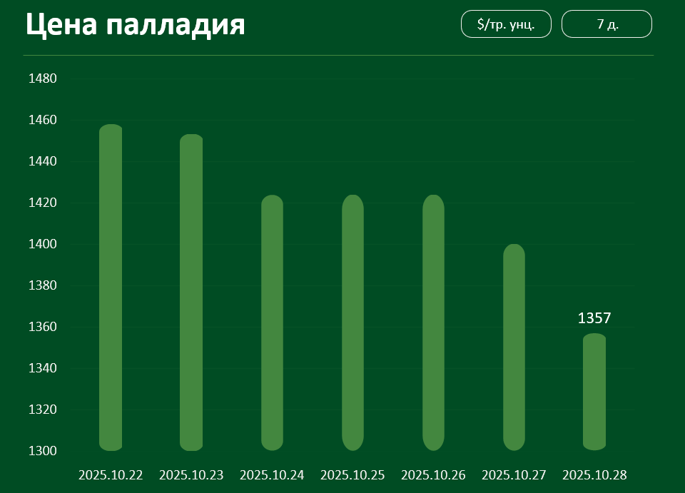 Мировая цена палладия с 22 по 28 октября снизилась примерно на 6,9%, достигнув 1357 $ за тройскую унцию.