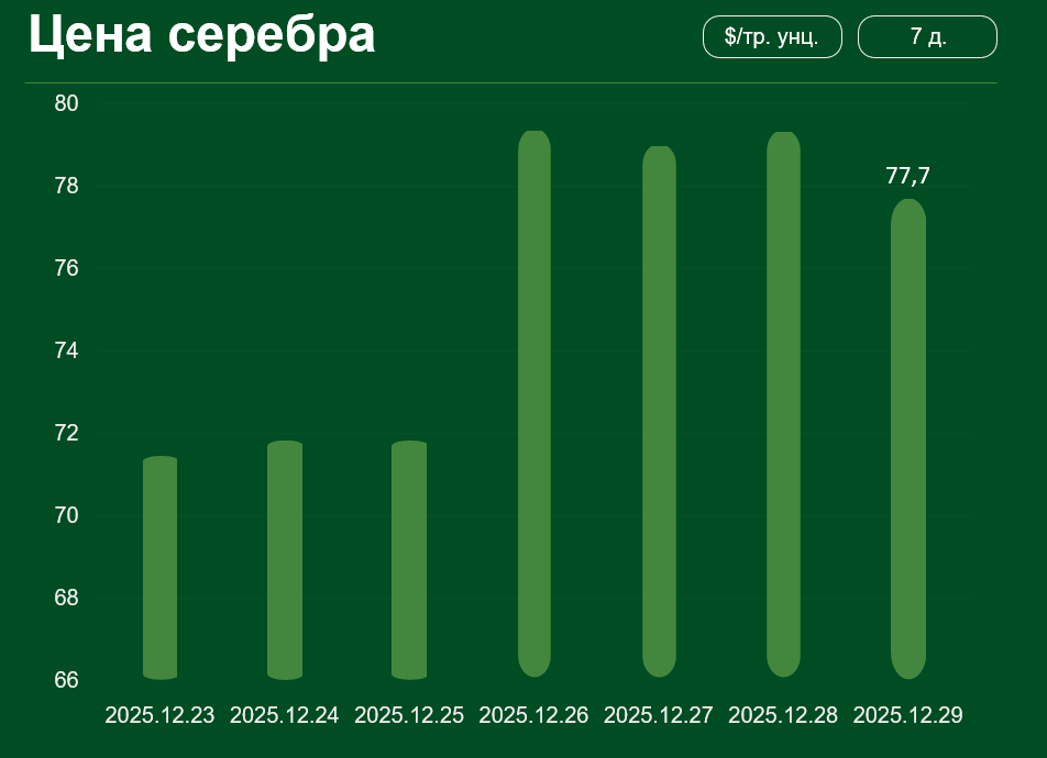 С 23 по 29 декабря мировая цена на серебро выросла более чем на 8,8%. 29 декабря цена серебра достигла 77,7 долл. США за тройскую унцию.