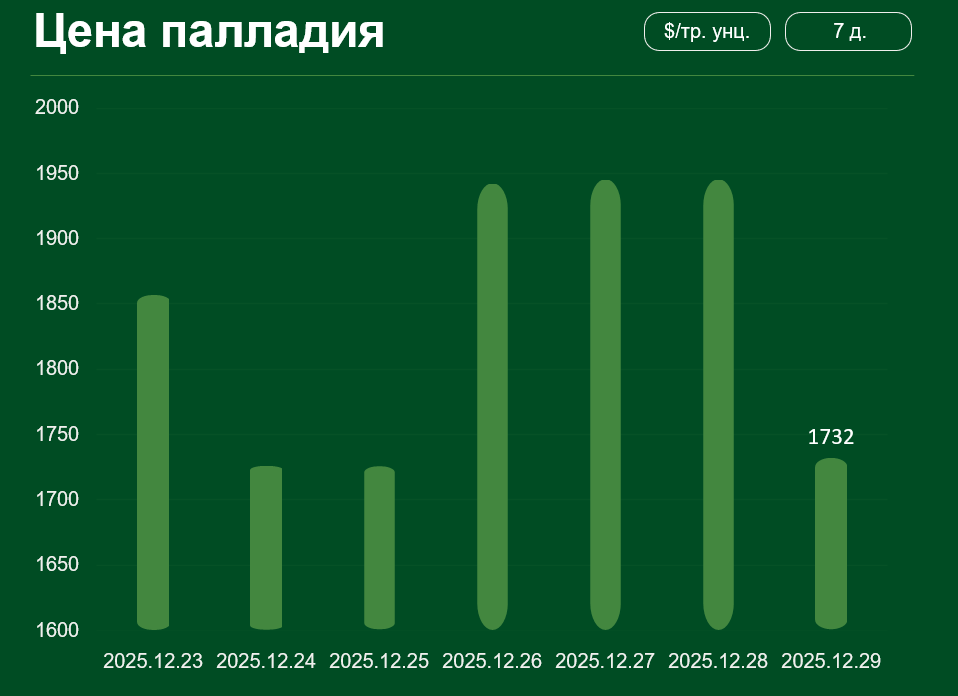 С 23 по 29 декабря мировая цена на палладий снизилась более чем на 6,5% и составила 1 732 долл. США за тройскую унцию.
