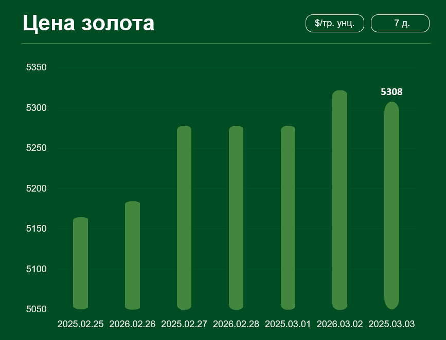 Мировая цена золота с 25 февраля по 3 марта выросла более чем на 2,7% и достигла 5 308 долларов США за тройскую унцию. Средняя цена золота в феврале составила 5 019 долларов за тройскую унцию.
