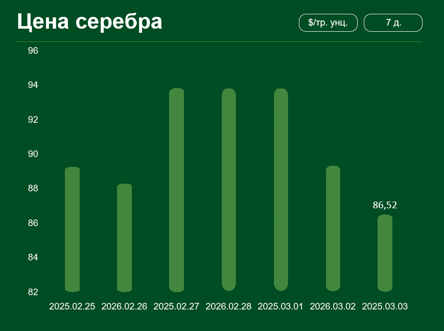 Мировая цена серебра снизилась более чем на 3% и достигла 86,52 доллара США за тройскую унцию. Средняя цена серебра в феврале составила 82,55 доллара за тройскую унцию.
