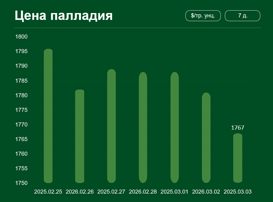 Мировая цена на палладий с 25 февраля по 3 марта снизилась более чем на 1,5% и достигла 1 767 долларов США за тройскую унцию. Средняя цена палладия в феврале составила 1 734 доллара за тройскую унцию.