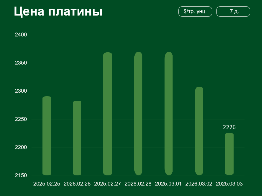 Мировая цена на платину за тот же период снизилась на 2,8% и достигла 2 226 долларов США за тройскую унцию. Средняя цена платины в феврале составила 2 140 долларов за тройскую унцию.