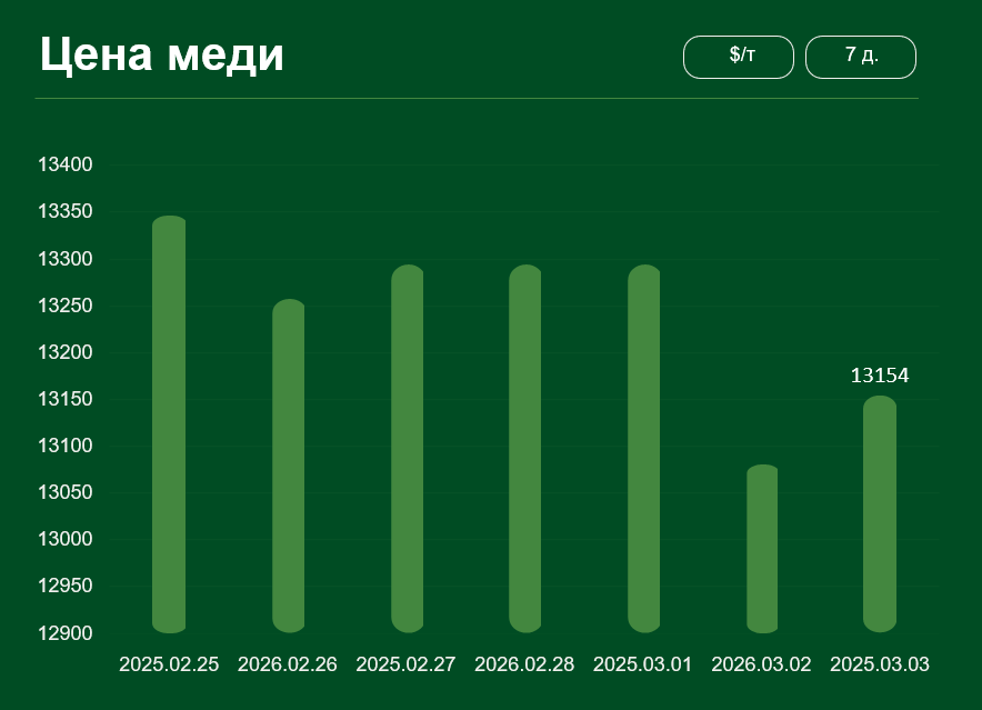 Мировая цена на медь с 25 февраля по 3 марта снизилась более чем на 1,4% и достигла 13 154 долларов США за тонну.