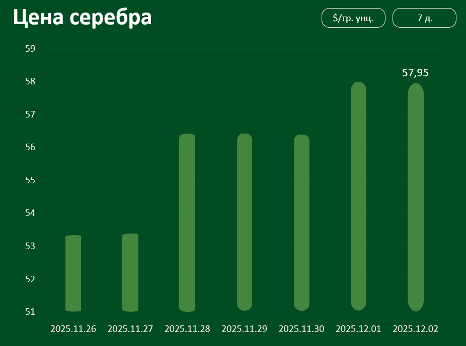 Мировая цена на серебро с 26 ноября по 2 декабря выросла более чем на 8,6% и достигла 57,95 $ за троицкую унцию.
