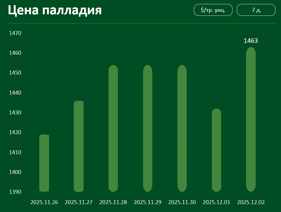 Мировая цена на палладий с 26 ноября по 2 декабря выросла более чем на 3% и достигла 1 463 $ за троицкую унцию.