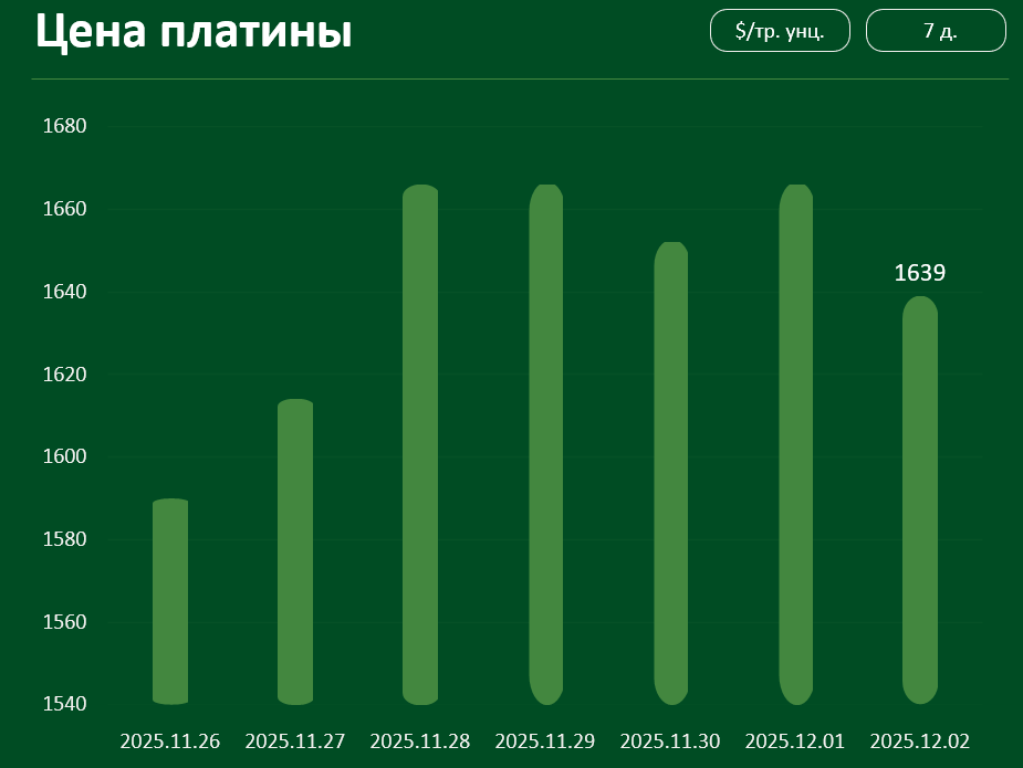 Мировая цена на платину за тот же период также выросла более чем на 3% и 2 декабря достигла 1 639 $ за троицкую унцию.